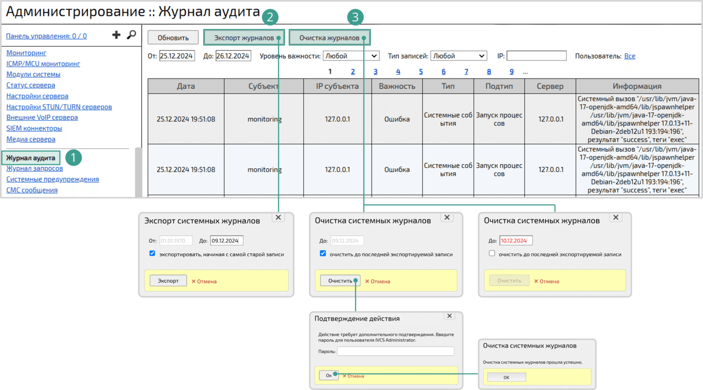 → Очистка системных журналов → Нажать кнопку Очистить → Подтверждение действия → Ввести пароль → Нажать кнопку Ок → Очистка системных журналов → Нажать кнопку ОКОчистить журналы можно только до той даты, до которой выполнялся экспорт журналов