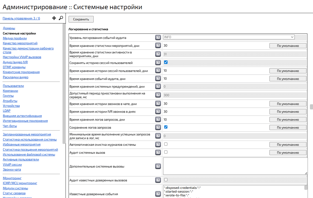 Секция Логирование и статистика → Поле Автоматическая очистка журналов системы → Выключить флаговую кнопку → Нажать кнопку Сохранить -