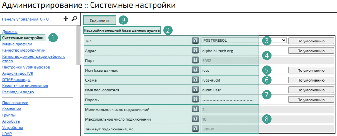 → Секция Настройки внешней базы данных аудита