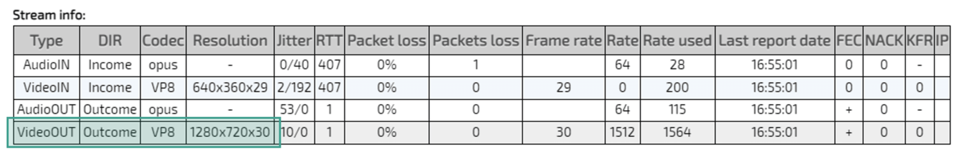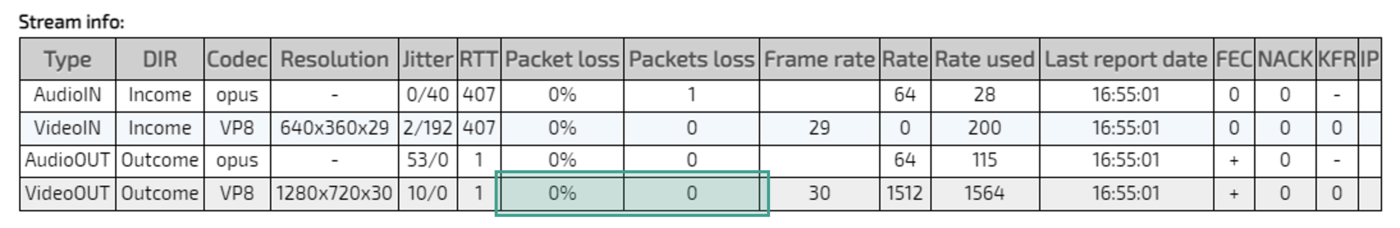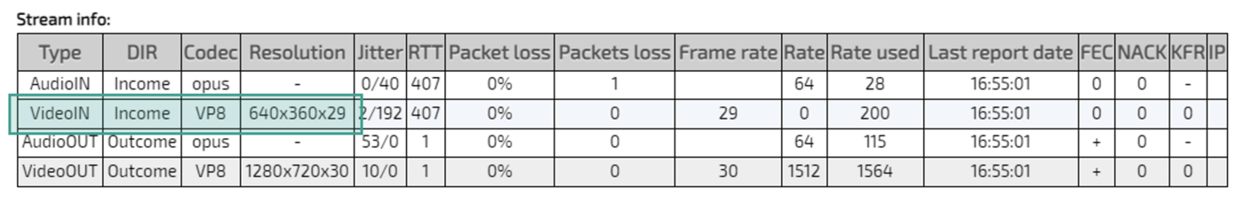 В статистике соединения отображается низкое качество видео |
