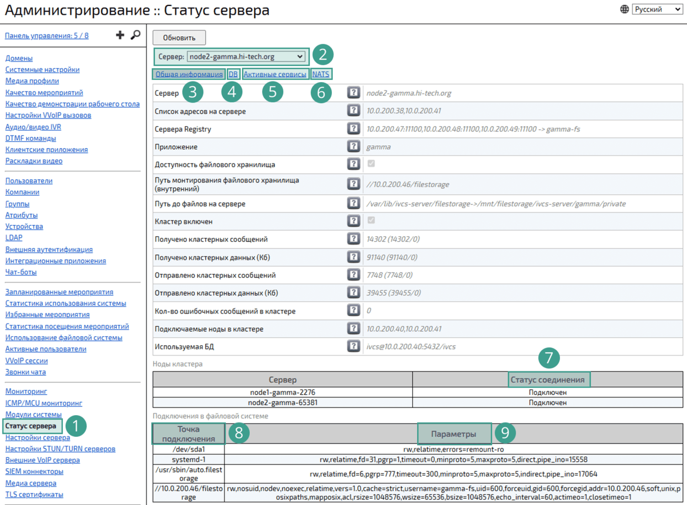 Платформа IVA MCU позволяет посмотреть общую информацию о статусе, состоянии и параметрах подключенных серверов.