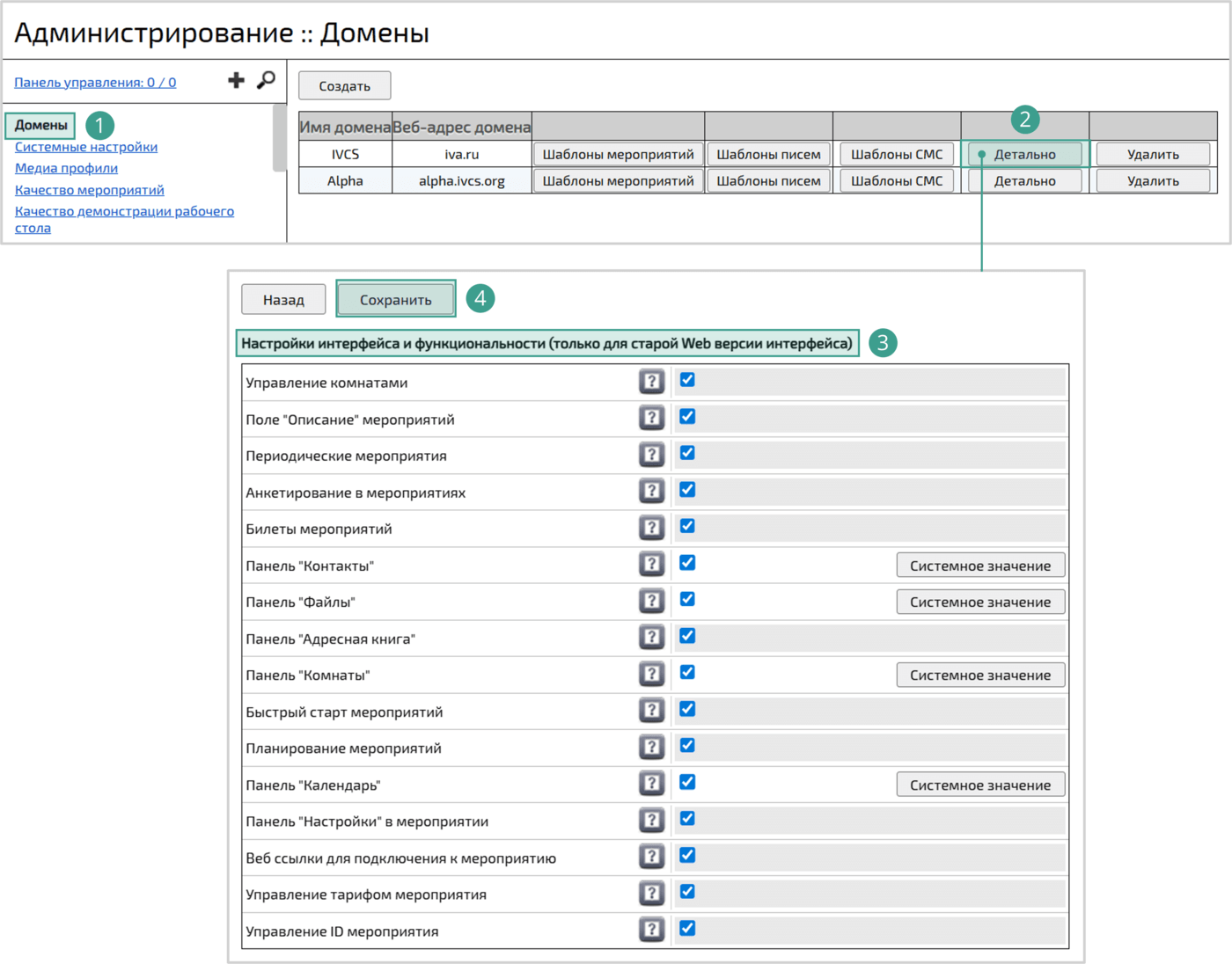 Войти в web-панель администрированияПерейти в раздел Домены ball 1Выбрать доменНажать кнопку Детально ball 2Перейти к секции Настройки интерфейса и функциональности (только для старой Web версии интерфейса) ball 3