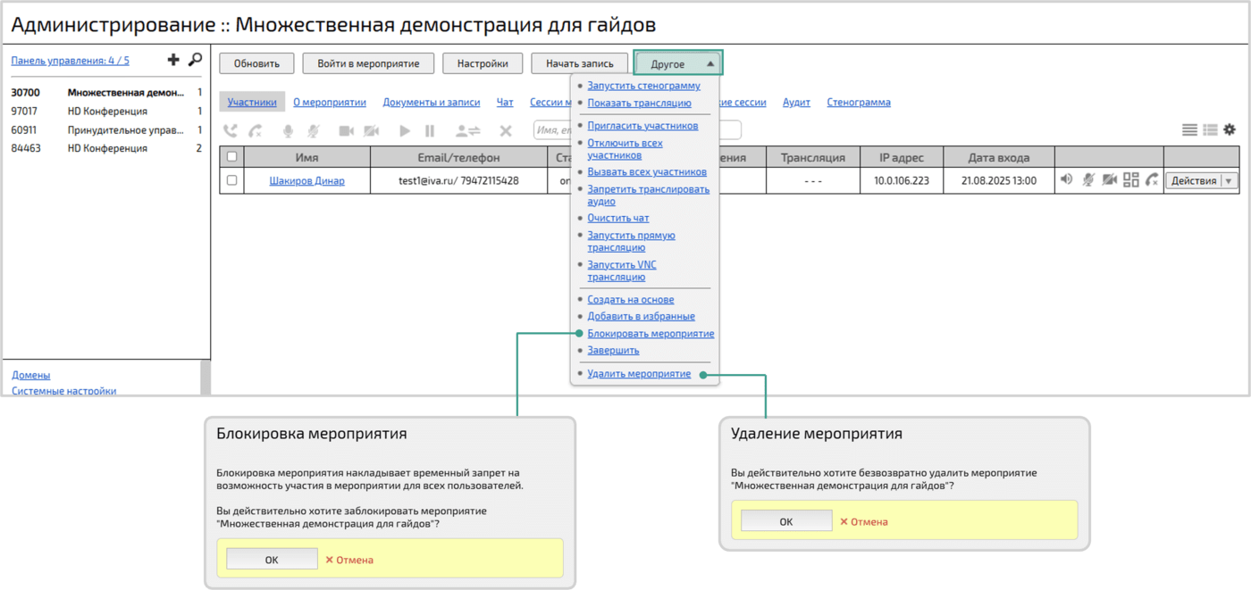 Для блокировки или удаления мероприятия Администратору Платформы IVA MCU , необходимо: