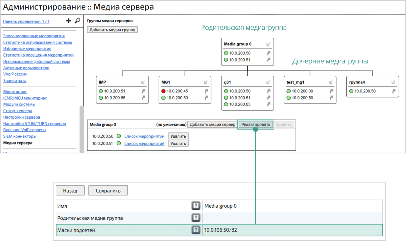 Настройку масок подсетей, по которым фильтруется подключение пользователей к мероприятию в случае географического распределения медиасерверов, необходимо проводить при настройке медиагрупп в разделе Медиа сервера web-панели администрирования. При этом в медиагруппе по умолчанию должен быть добавлен хотя бы один медиасервер