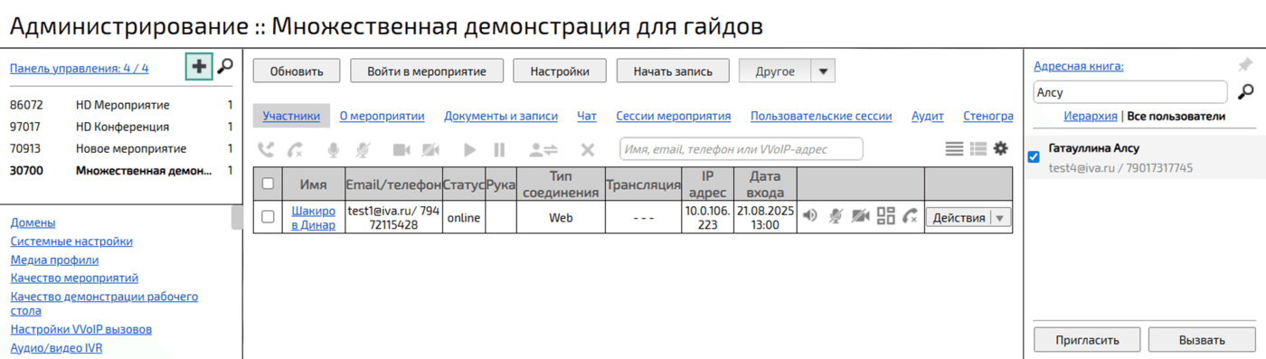 Нажать ссылку добавить участниковВыбор пользователейДобавить пользователейНажать кнопку ВыбратьНажать кнопку НастройкиНастроить возможности каждого из участников (присвоение прав модератора и / или докладчика, настройка прав на трансляцию и т. д.) → Нажать кнопку Сохранить изменения