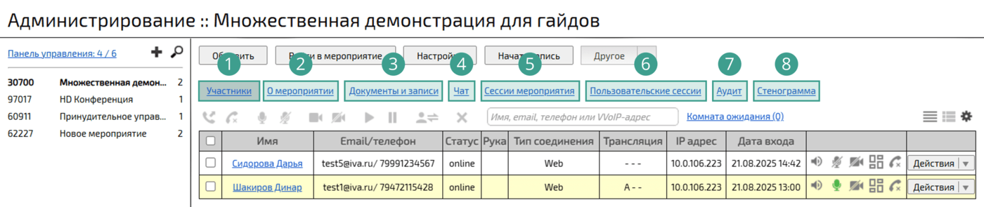 Также вкладка Участники информационной панели мероприятия содержит кнопки, обеспечивающие быстрый доступ к действиям над участниками мероприятия.