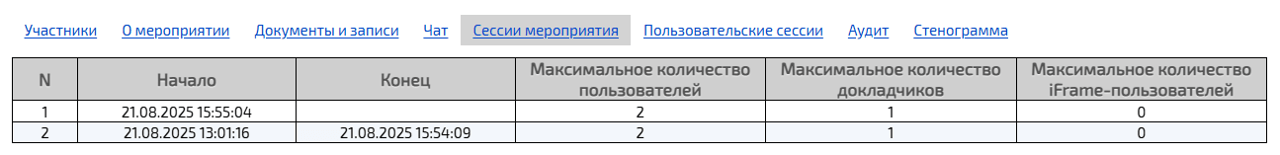 Вкладка Сессии мероприятий информационной панели мероприятия содержит информацию о количестве пользователей, находящихся в мероприятии: максимальное количество пользователей, докладчиков и iFrame-пользователей, а также начало и конец каждой сессии мероприятия.