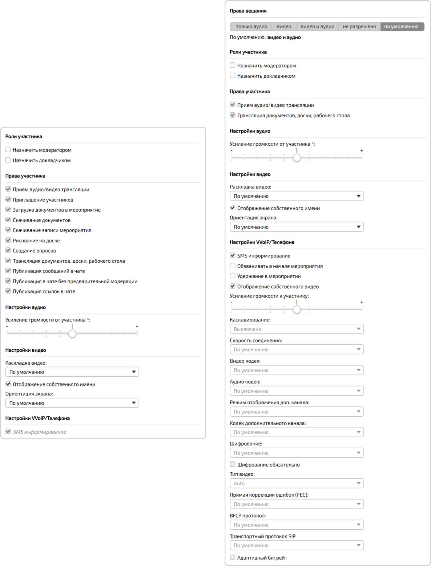 | Поля настроек для WebRTC- / VVoIP-участников и участников статусом online / offline отличаются |