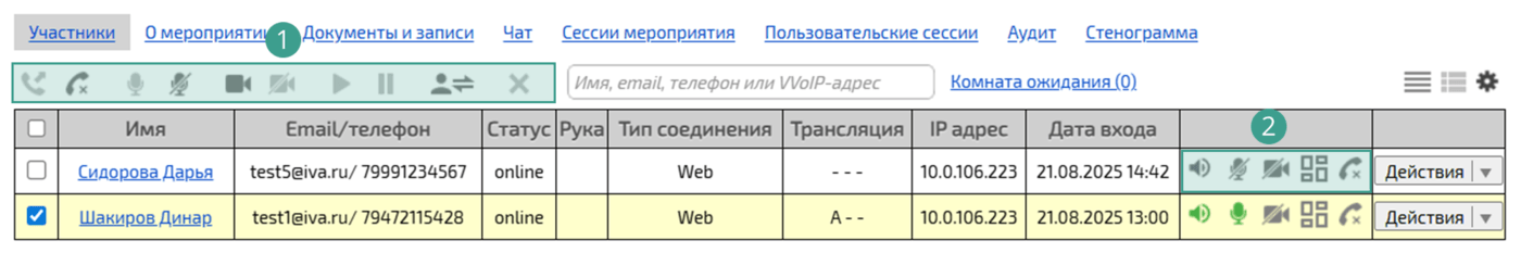— при нажатии выбранный пользователь будет отключен от мероприятия. Кнопка активна только для пользователей, находящихся в мероприятии (статус online) -