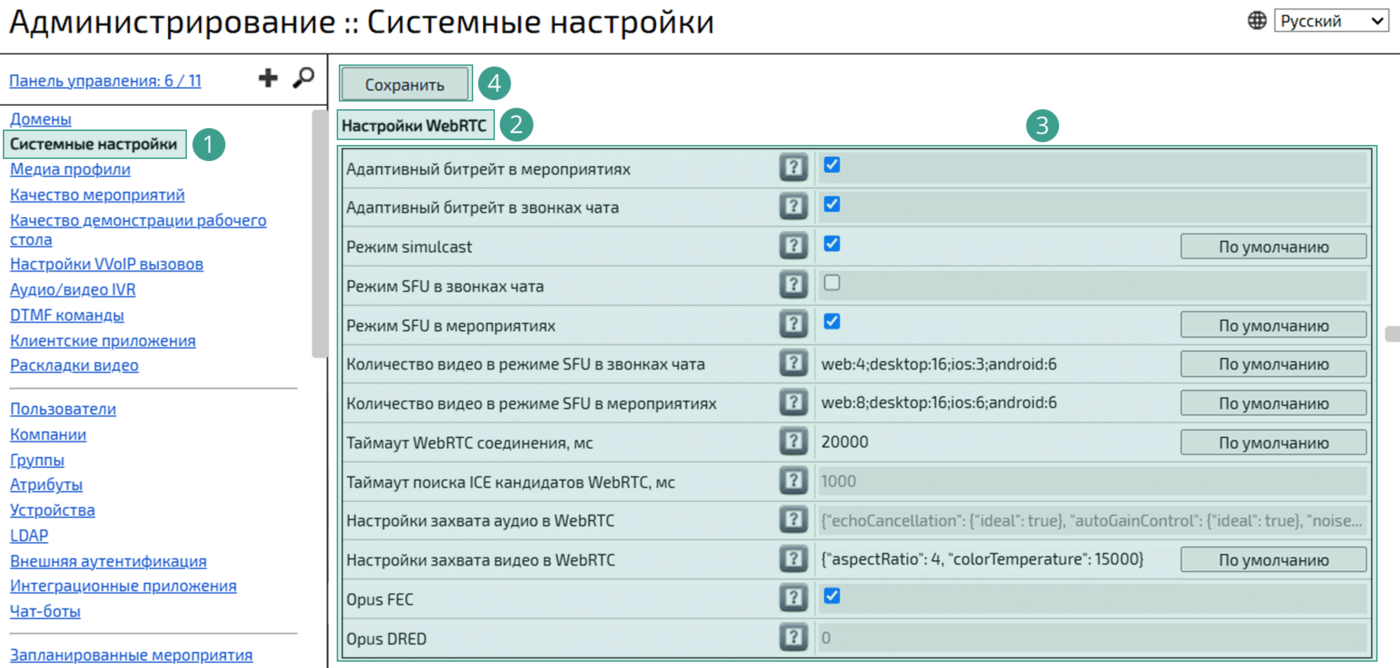 В секции Настройки WebRTC раздела Системные настройки web-панели администрирования Платформы можно: