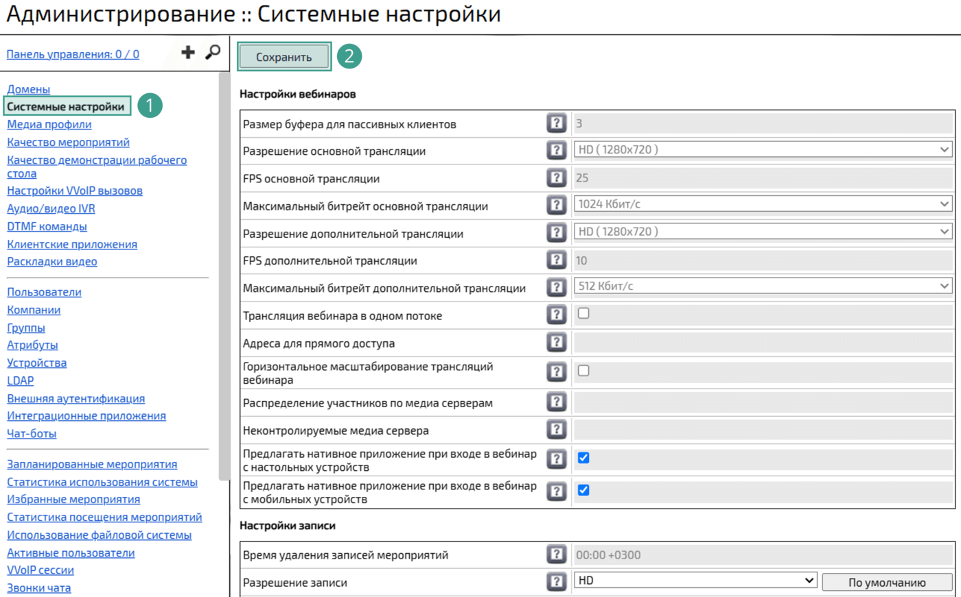 Войти в web-панель администрирования → Перейти в раздел Системные настройки