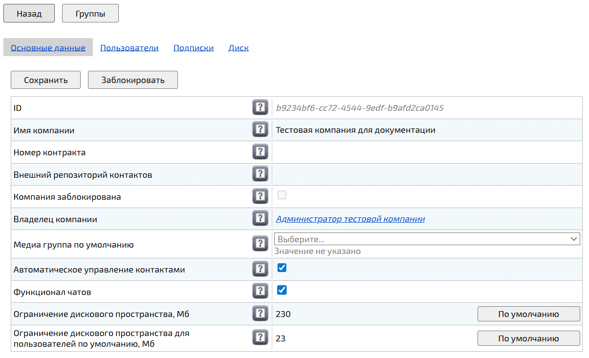 Для редактирования основных данных компании доступны следующие параметры: Имя компании и Внешний репозиторий контактов, который выдает контакты в формате JSON, а также Медиа группа по умолчанию, Автоматическое управление контактами, Функционал чатов, Ограничение дискового пространства и Ограничение дискового пространства для пользователей по умолчанию.
