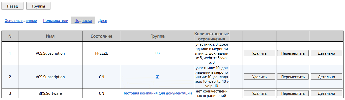 Подписки групп компании → Нажать кнопку Детально → Подписка группы → Внести изменения (при необходимости) → Нажать кнопку Сохранить