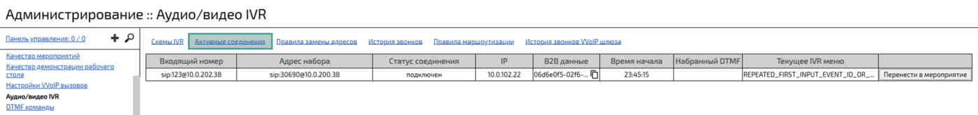 Войти в web-панель администрирования → Перейти в раздел Аудио/видео IVR → Вкладка Активные соединения