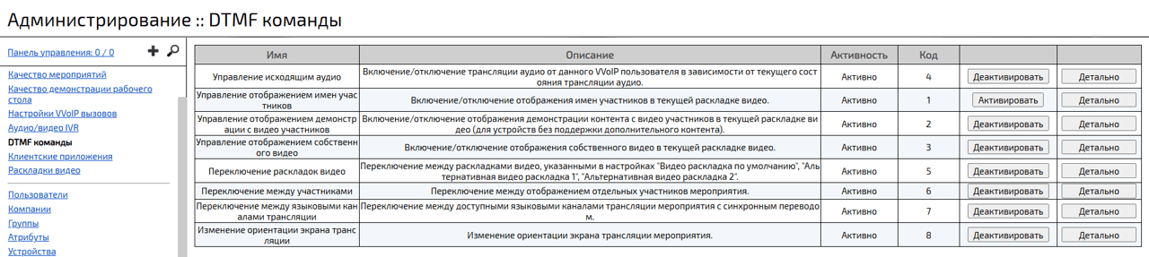 Администратор Платформы IVA MCU имеет возможность управлять DTMF-командами, которые обеспечивают: