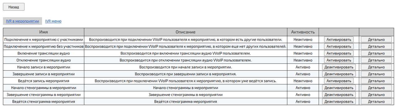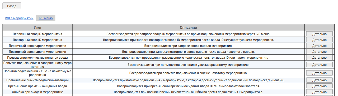 вкладка IVR в мероприятии — сообщения IVR меню, используемые в мероприятиях