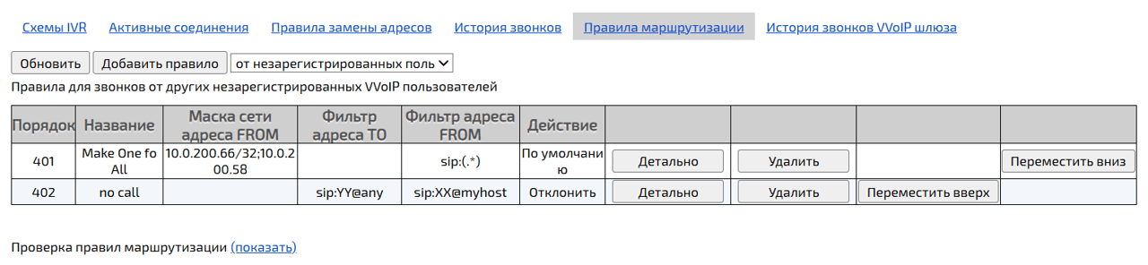 Чтобы зарегистрированные VVoIP-пользователи могли звонить на другие направления, необходимо настроить правило маршрутизации с действием Разрешить.