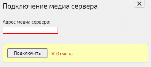 Перейти в секцию Нераспределенные медиа сервера → Нажать кнопку Подключить медиа сервер → Окно Подключение медиа сервера → Поле Адрес медиа сервера → Ввести IP-адрес медиасервера → Нажать кнопку Подключить