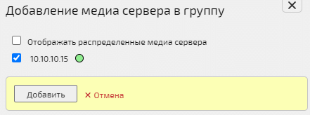 Перейти в секцию Группы медиа серверов → Выбрать медиагруппу → Нажать кнопку Добавить медиа сервер → Окно Добавление медиа сервера в группу → Включить флаговую кнопку в строке выбранного медиасервера → Нажать кнопку Добавить