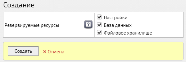 Управление резервными копиями → Нажать кнопку Создать резервную копию → Создание → Выбрать резервируемые ресурсы: Настройки, База данных (если используется локальная база данных), Файловое хранилище (если используется внешнее файловое хранилище, то для создания резервной копии рекомендуется использовать внешние средства) → Нажать кнопку Создать