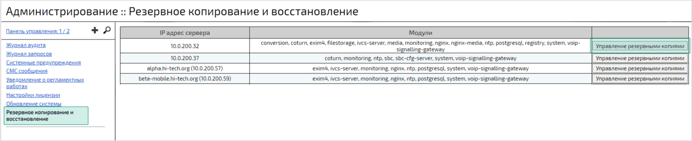Открыть web-панель администрирования Платформы IVA MCU → Перейти в раздел Резервное копирование и восстановление → Выбрать второй головной сервер → Нажать кнопку Управление резервными копиями → Управление резервными копиями