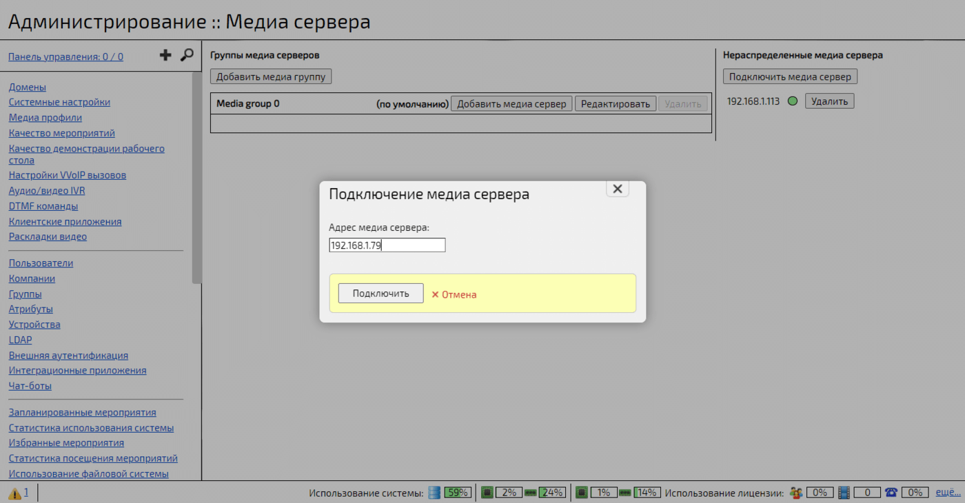 в окне Подключение медиа сервера указать IP-адрес медиасервера и нажать кнопку Подключить