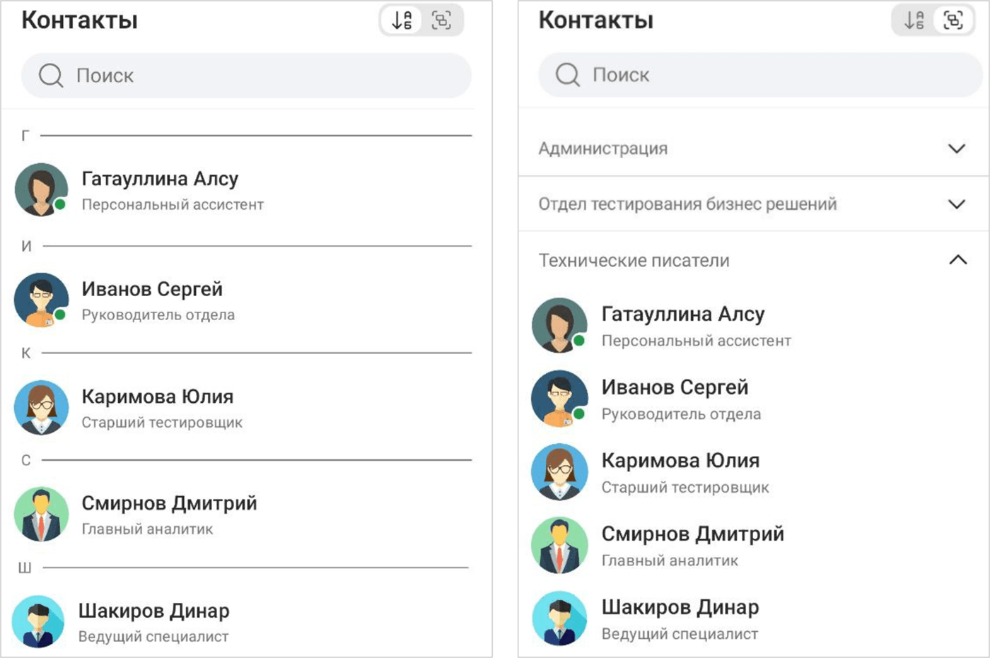 | Список контактов отсортирован в алфавитном порядке |