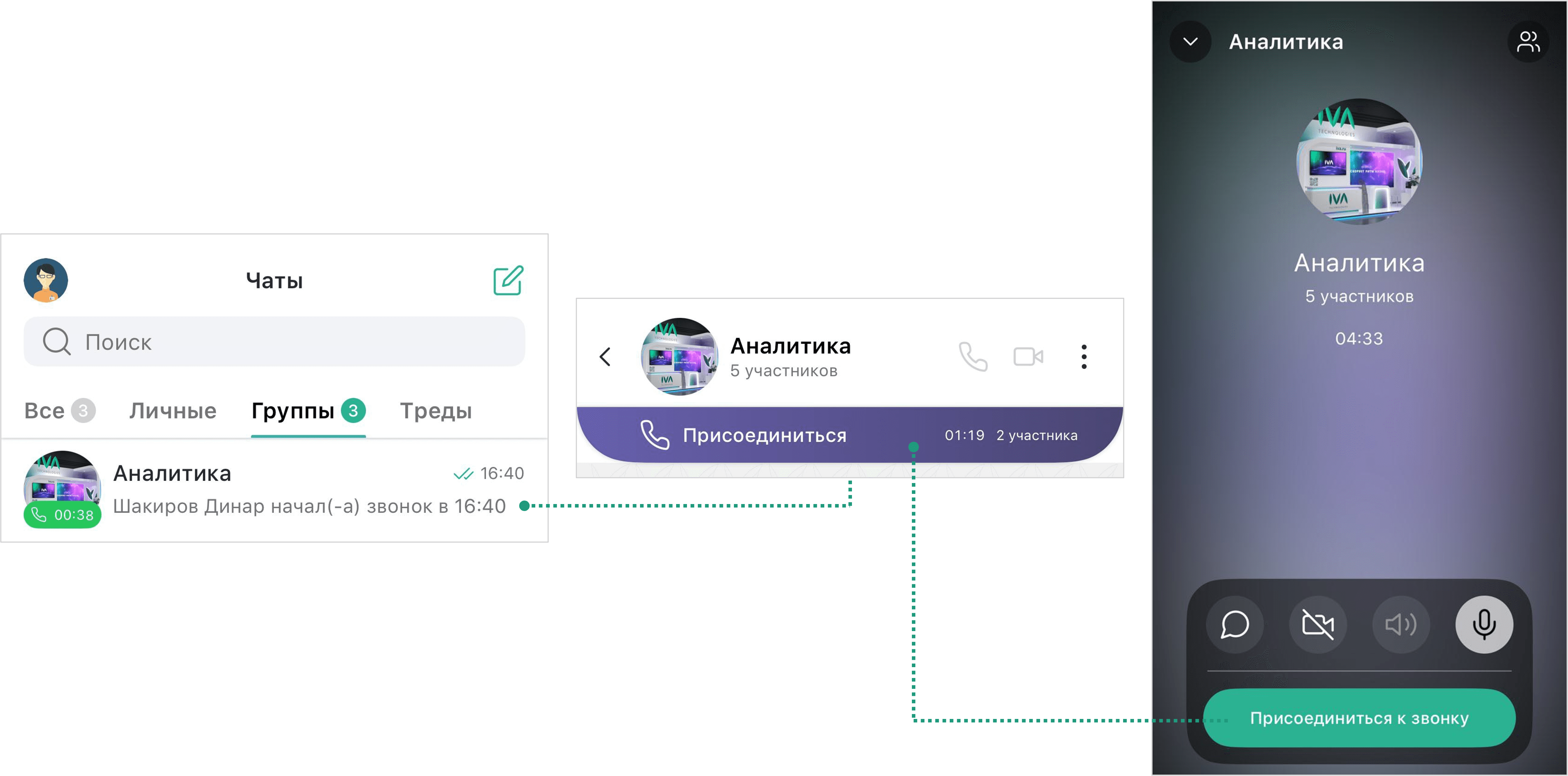 → Все / Группы → Открыть чат с активным вызовом → Нажать Присоединиться → Окно вызова → Нажать Присоединиться к звонку