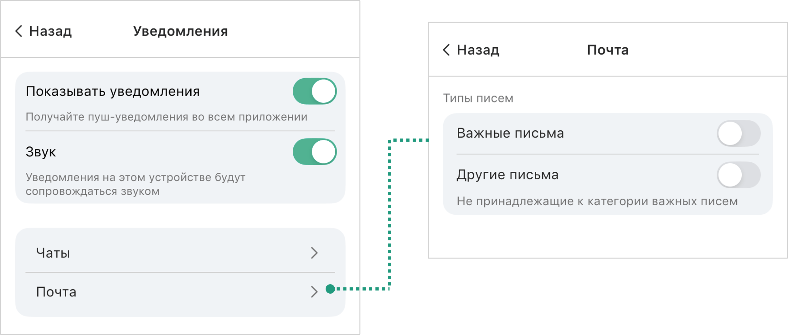 → Почта → Настроить отображение почтовых уведомлений: Важные письма / Другие письма