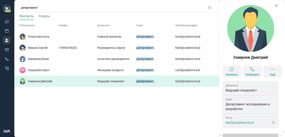 В разделе Контакты каждому зарегистрированному пользователю IVA One доступен список всех контактов пользователей, зарегистрированных в компании.