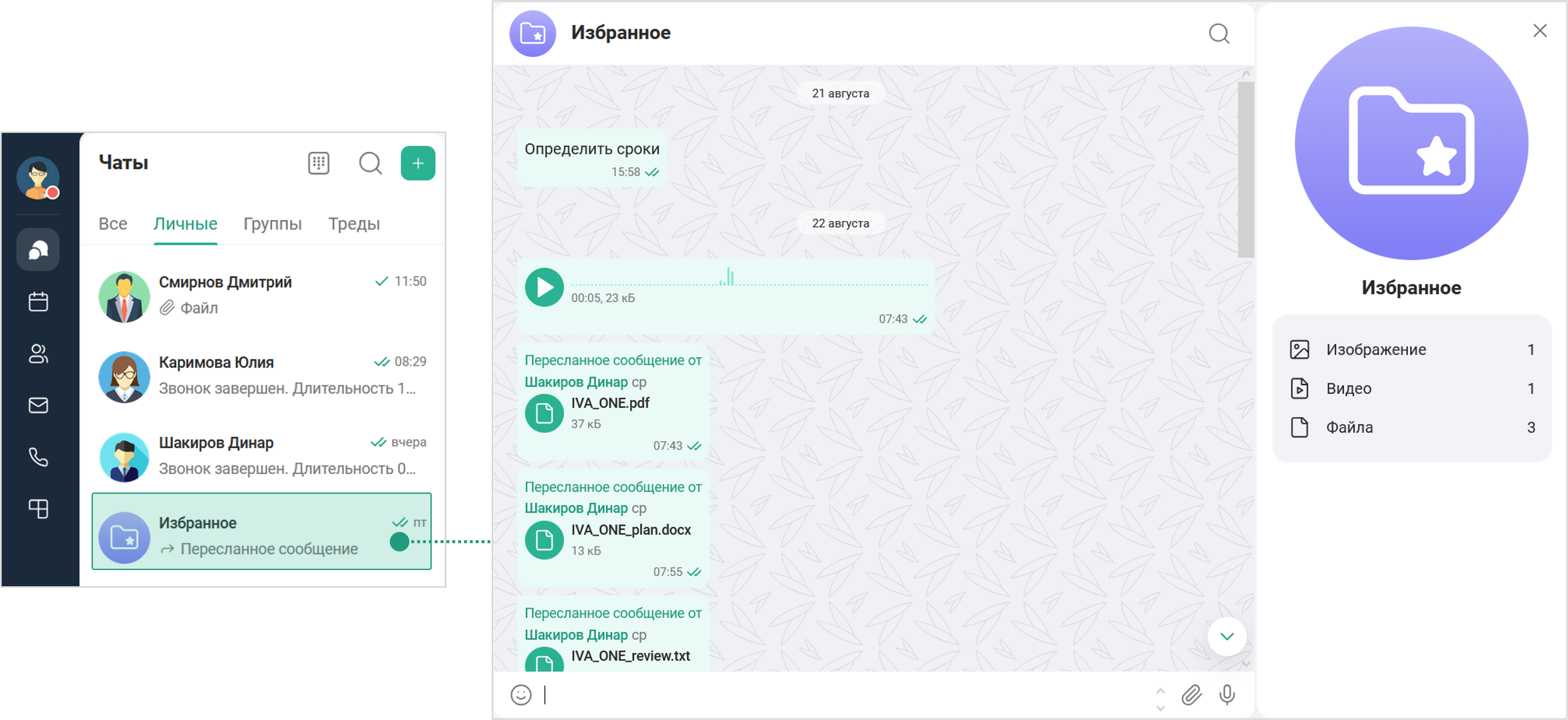 Приложение IVA One обеспечивает следующие возможности чата Избранное: