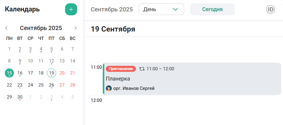 По умолчанию при открытии раздела Мероприятия пользователи видят собственный календарь мероприятий на текущий день.