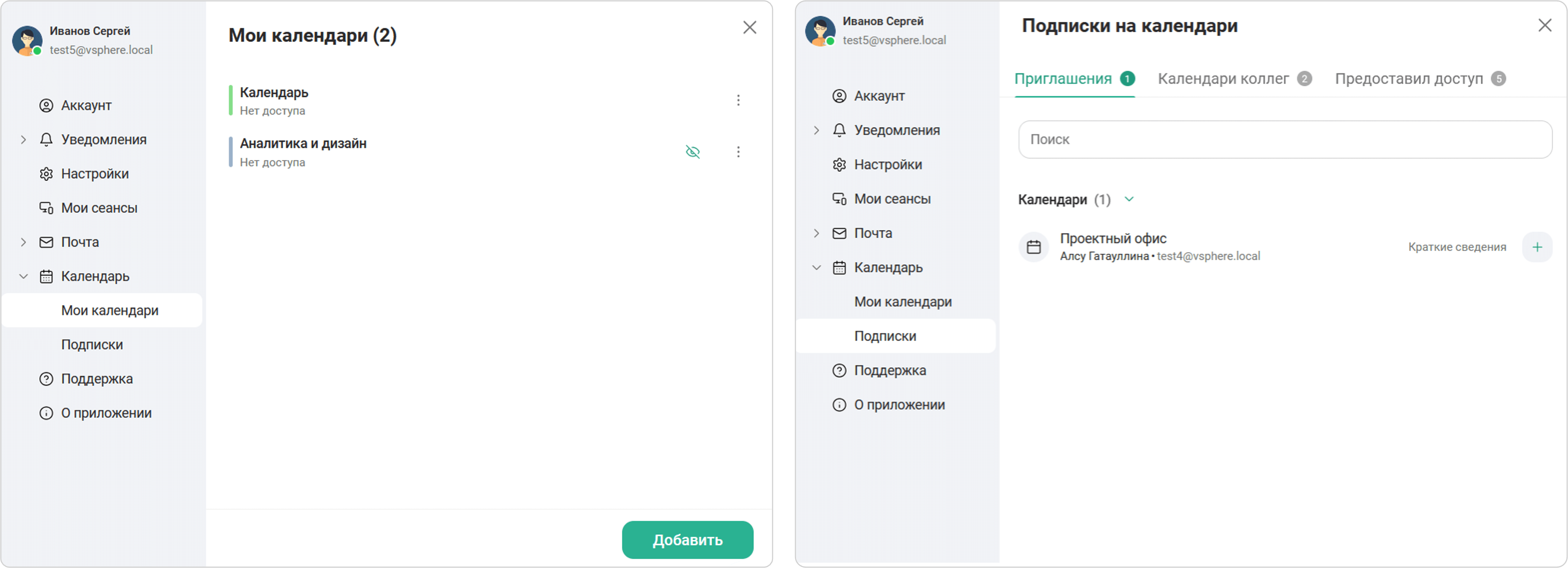 Во вкладке Календарь отображаются собственные календари пользователя и календари, находящиеся в общем доступе — календари других пользователей, к которым у пользователя есть право доступа / собственные календари пользователя, доступные другим пользователям.