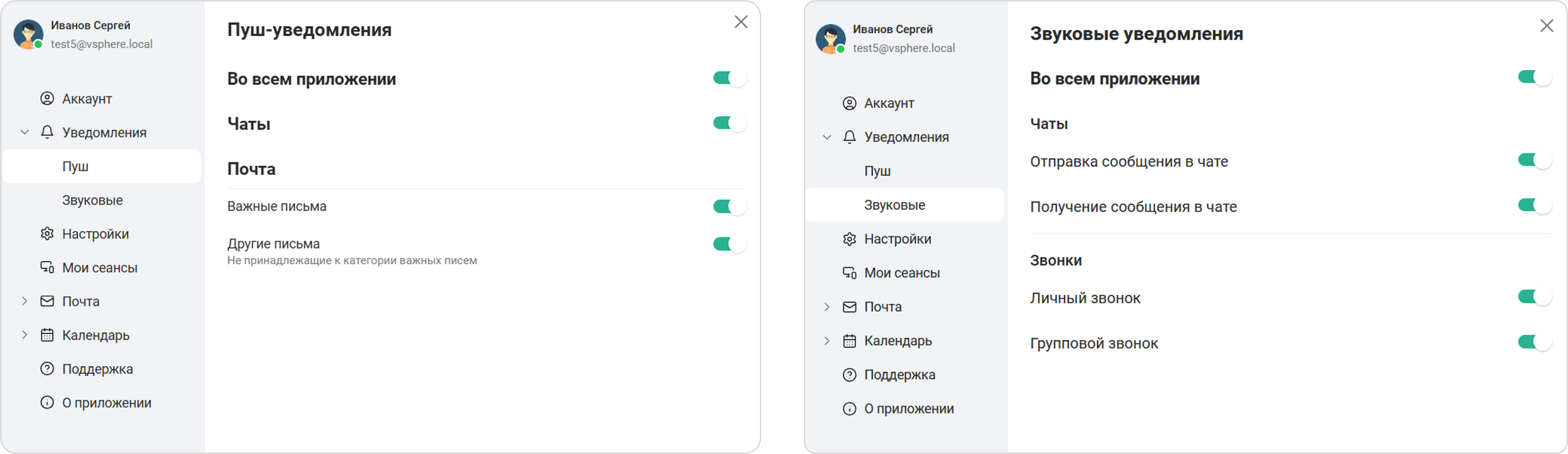 Настройка push-уведомлений для чатов (секция Чаты) и почты (секция Почта) доступна только в том случае, если push-уведомления включены во всем Приложении — переключатель в поле Во всем приложении находится в активном положении