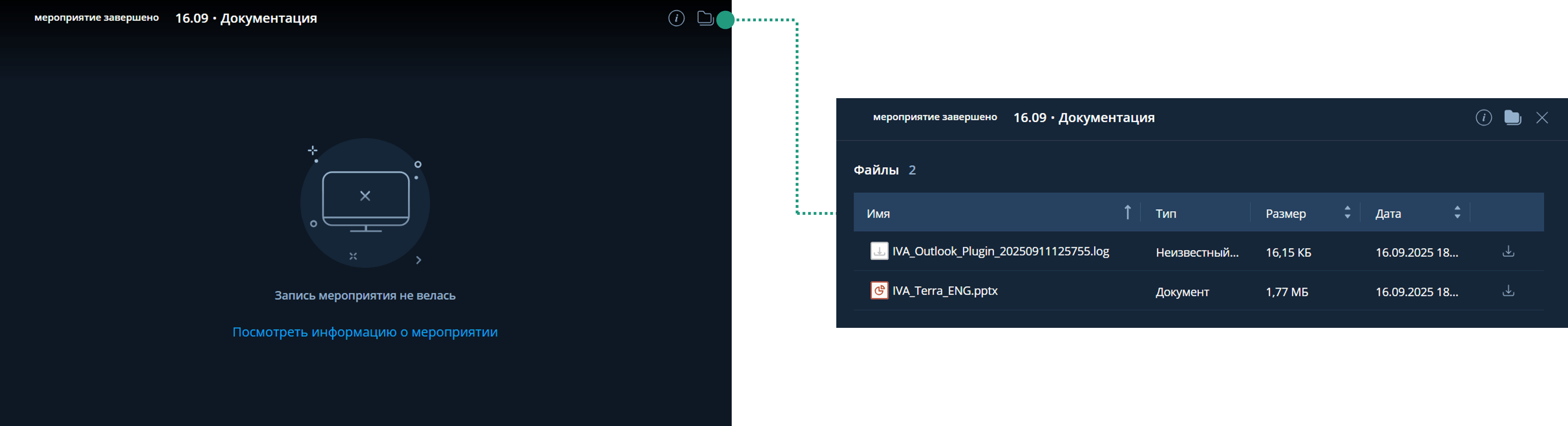 После окончания мероприятия его участникам доступна возможность просмотра контента прошедшего мероприятия. Возможность скачивания и просмотра материалов мероприятия зависит от настроек мероприятия.