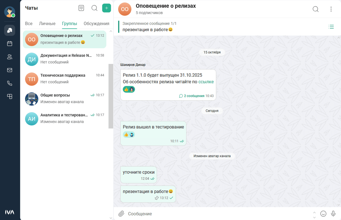 После авторизации в системе происходит переход в рабочее пространство web-интерфейса IVA One, в раздел Чаты с отображением последнего полученного / отправленного сообщения.