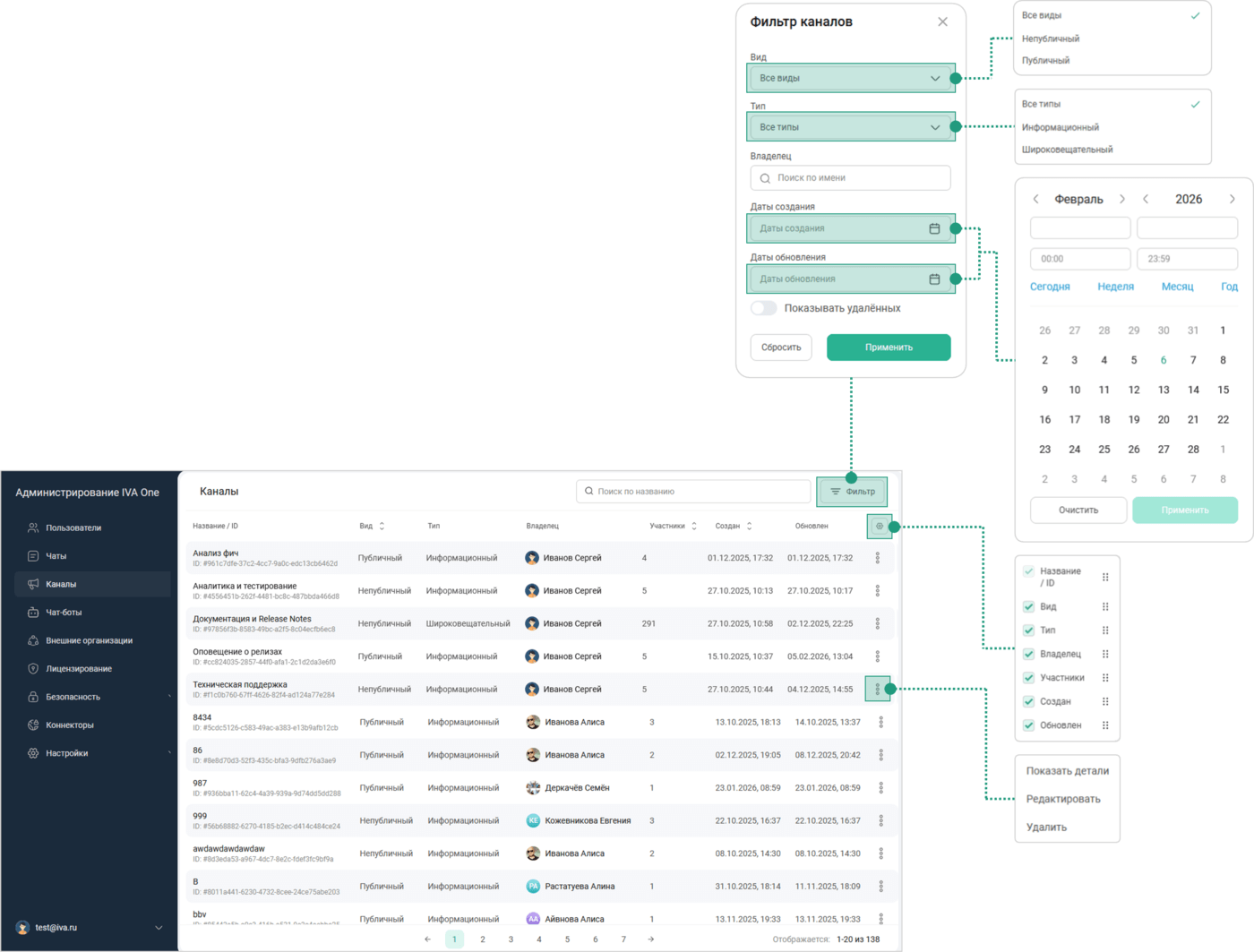 → Выбрать Вид: Все виды / Непубличный / Публичный (при необходимости) → Выбрать Тип: Все типы / Информационный / Широковещательный (при необходимости) → Ввести Владельца (при необходимости) → Даты создания: Выбрать диапазон дат (при необходимости) → Даты обновления: Выбрать диапазон дат (при необходимости) → Показывать удалённых (включить