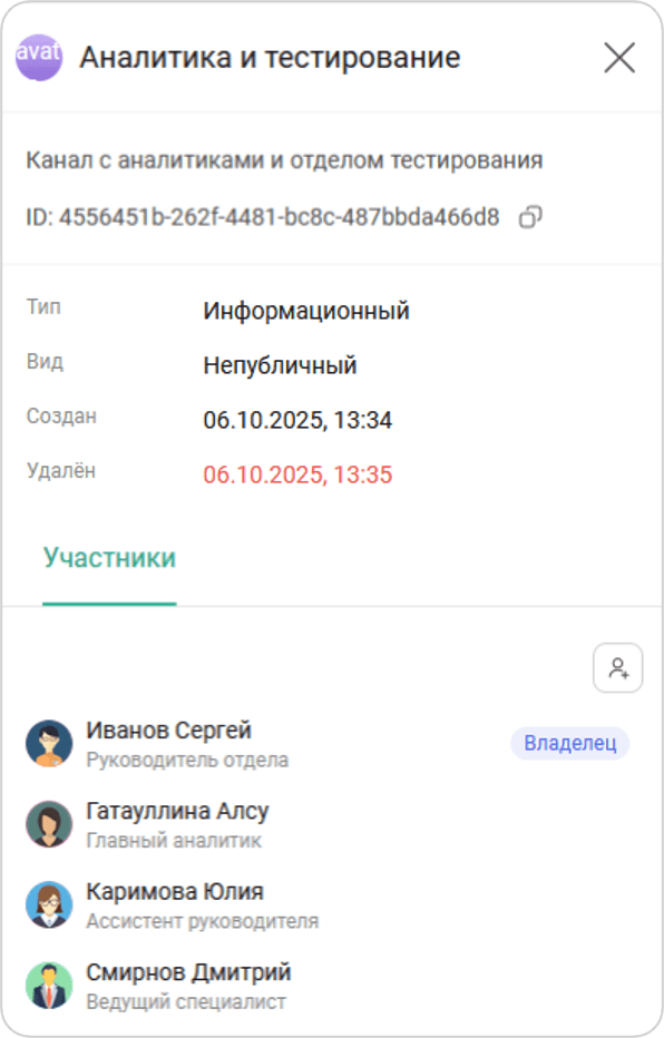 Для удаленных каналов в карточке информации о канале отображается дата и время удаления канала |