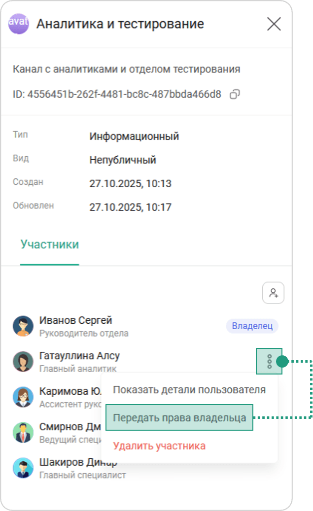 Чтобы передать права Владельца другому участнику канала, необходимо: Информация о канале → Участники → Выбрать участника → Нажать на кнопку → Нажать Передать права владельца