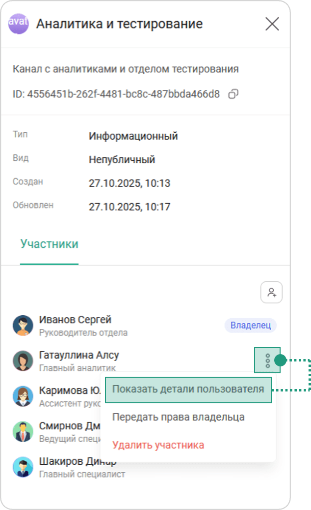 Для просмотра информации об участнике канала необходимо: Информация о канале → Участники → Выбрать участника → Нажать на кнопку → Нажать на кнопку Показать детали пользователя → Детали пользователя