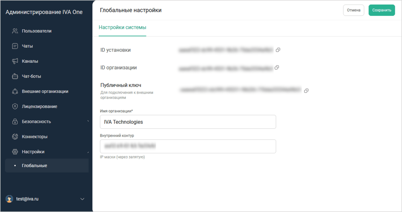 В разделе Глобальные можно просмотреть атрибуты идентификации организации, изменить Имя организации и IP-адрес внутреннего контура.