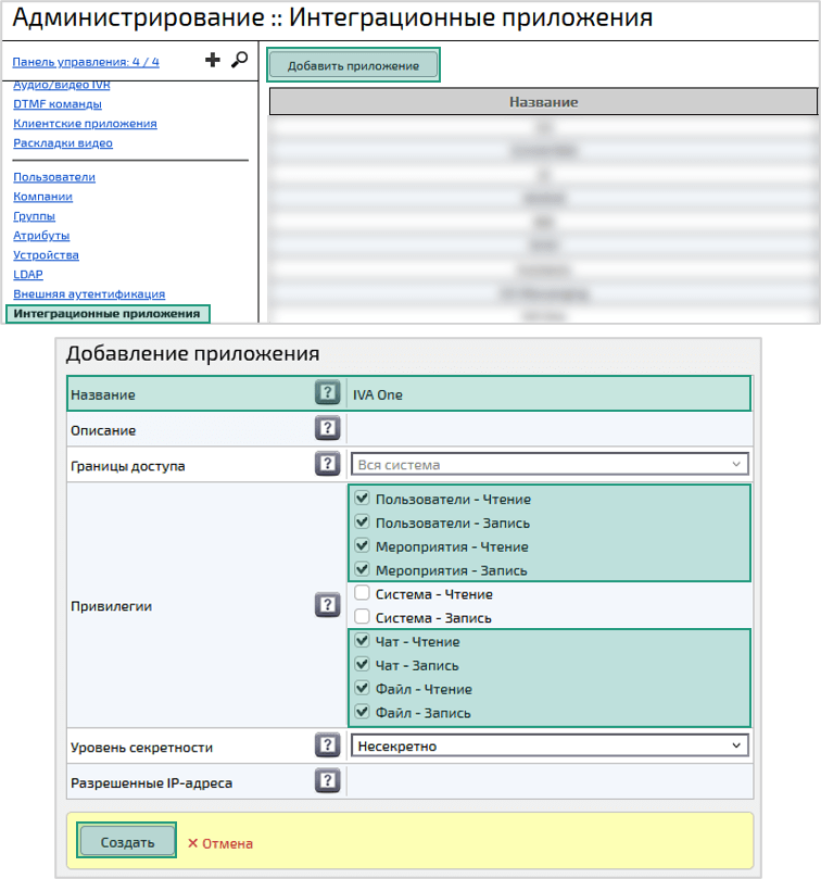 Web-панель администрирования IVA MCU → Перейти в раздел Интеграционные приложения → Добавить приложениеДобавление приложения:
