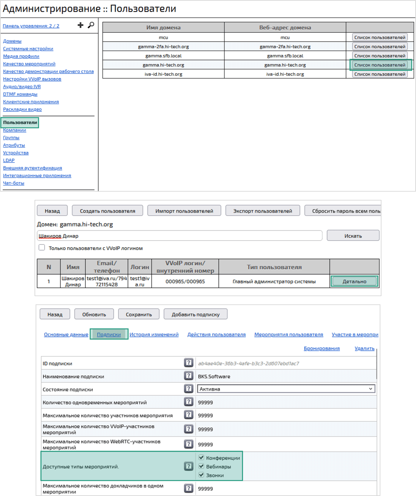 Перейти в раздел Пользователи → Выбрать Имя домена → Нажать кнопку Список пользователей → Выбрать / найти пользователя → Нажать кнопку Детально → Перейти во вкладку Подписки → В строке Доступные типы мероприятий включить флаговые кнопки: Конференции, Вебинары и Звонки -