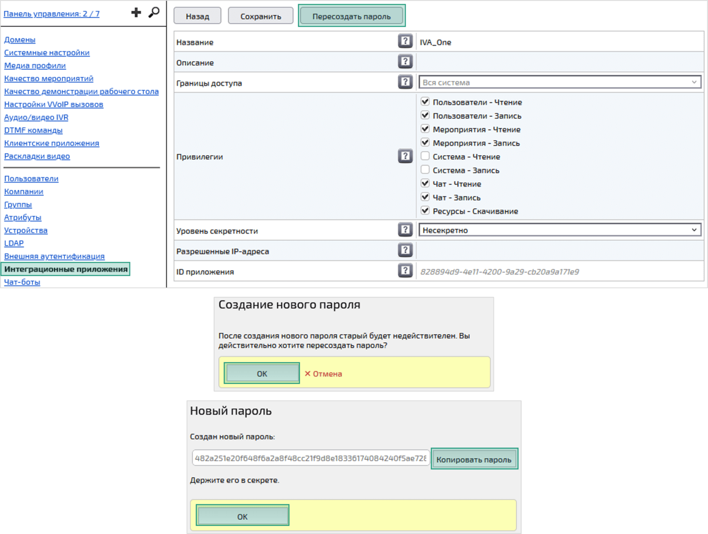 Web-панель администрирования IVA MCU → Перейти в раздел Интеграционные приложения → Выбрать приложение → Нажать кнопку Пересоздать пароль → Создание нового пароля → Нажать кнопку ОК → Новый пароль → Нажать кнопку Копировать пароль → Нажать кнопку ОК → Сохранить парольПосле создания нового пароля приложения старый пароль будет недействителен