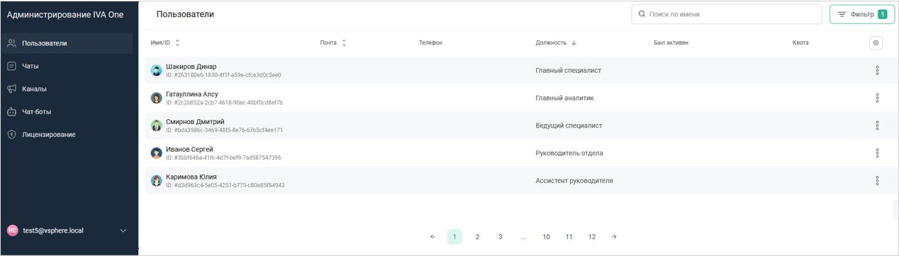 Пользователи: просмотр информации о пользователях (Имя / ID, почта, телефон, должность, Был Активен, Квота)