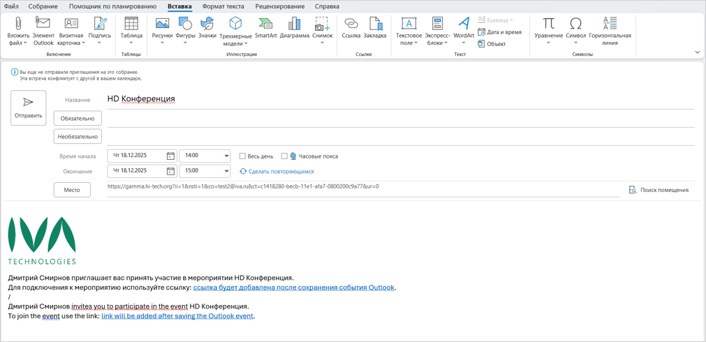 → Календарь → Нажать кнопку Запланировать мероприятие → Выбрать шаблон мероприятия (Переговорная комната, HD Вебинар, HD Конференция, HD Лекция, пользовательский и т. д.)