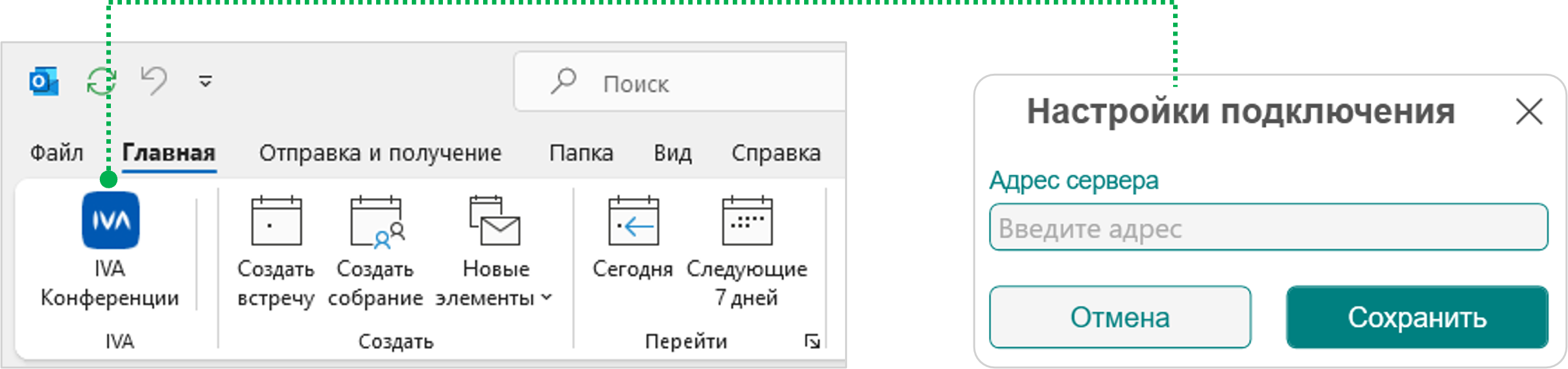 OutlookНажать кнопку Иконка календарьКалендарьНажать кнопку IVA КонференцииНастройки подключенияВвести адрес сервераНажать кнопку Сохранить