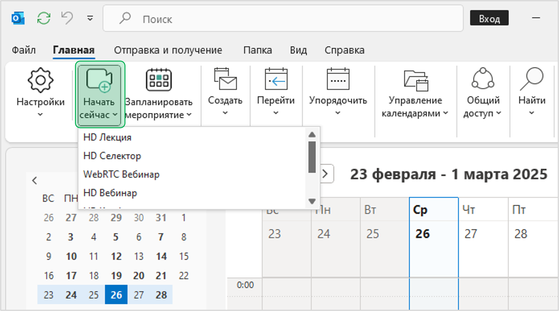 OutlookНажать кнопку Иконка календарьКалендарьНажать кнопку Начать сейчасВыбрать шаблон мероприятия (HD Лекция, HD Селектор, пользовательский и т.д.)