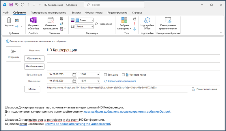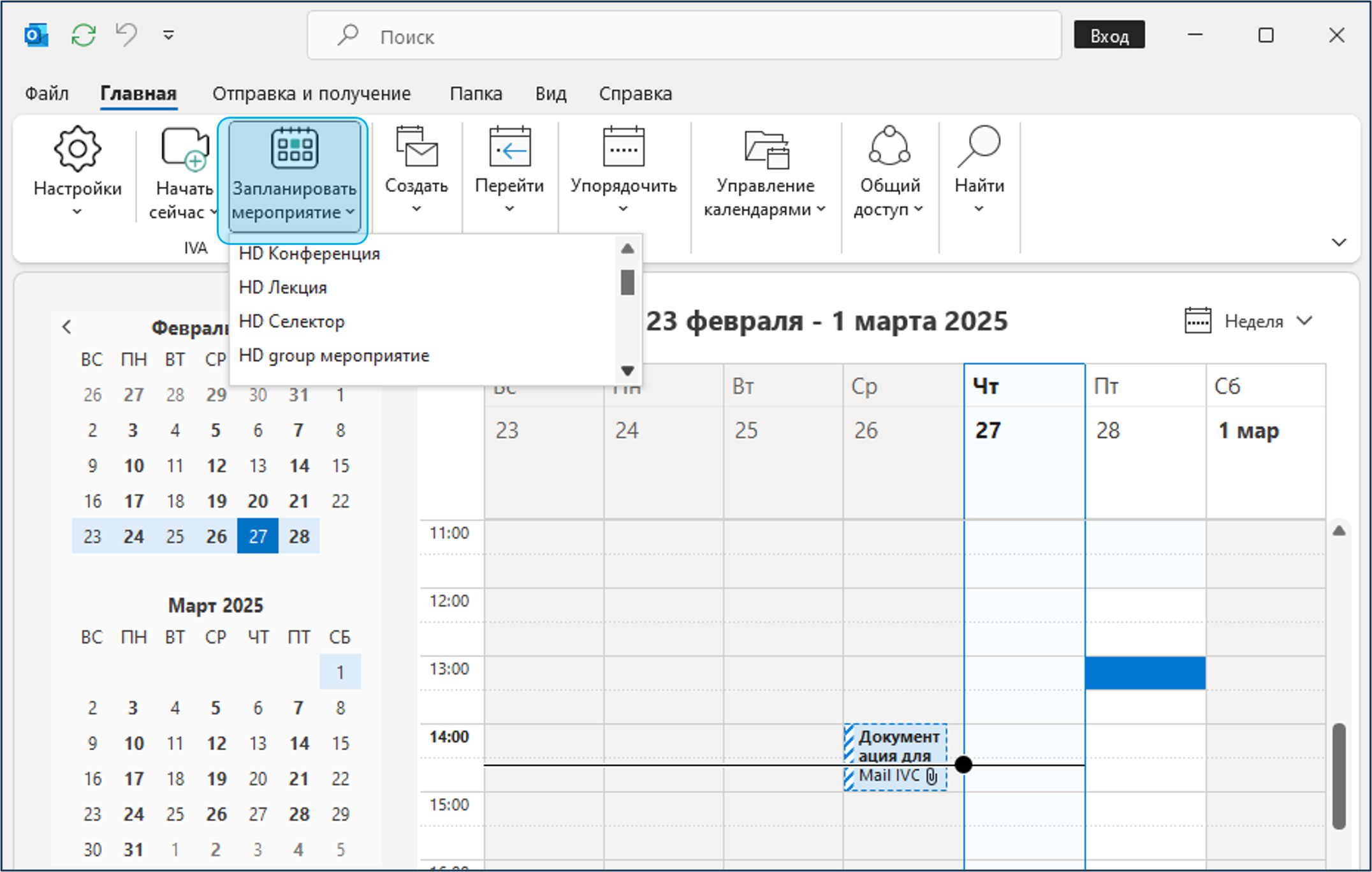 OutlookНажать кнопку Иконка календарьКалендарьНажать кнопку Запланировать мероприятиеВыбрать шаблон мероприятия (Переговорная комната, HD Вебинар, HD Конференция, HD Лекция, пользовательский и т. д.)