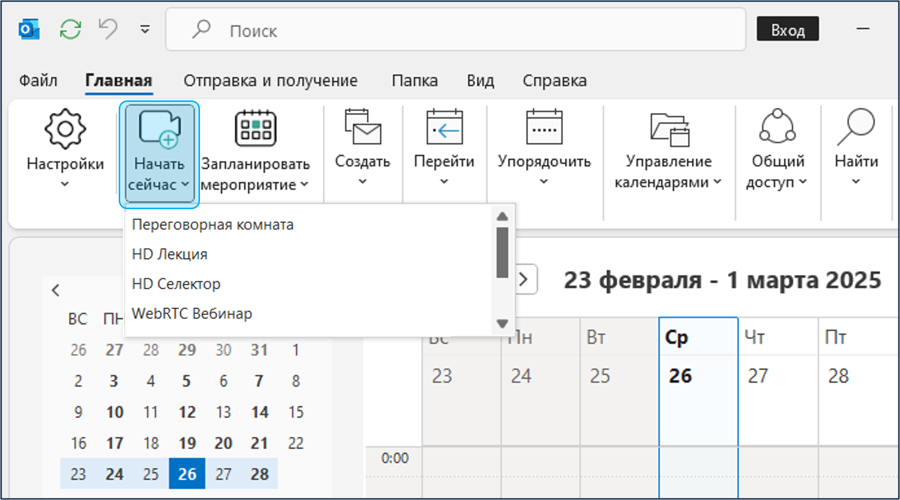 → Календарь → Нажать кнопку Начать сейчас → Выбрать шаблон мероприятия (HD Лекция, HD Селектор, пользовательский и т.д.)